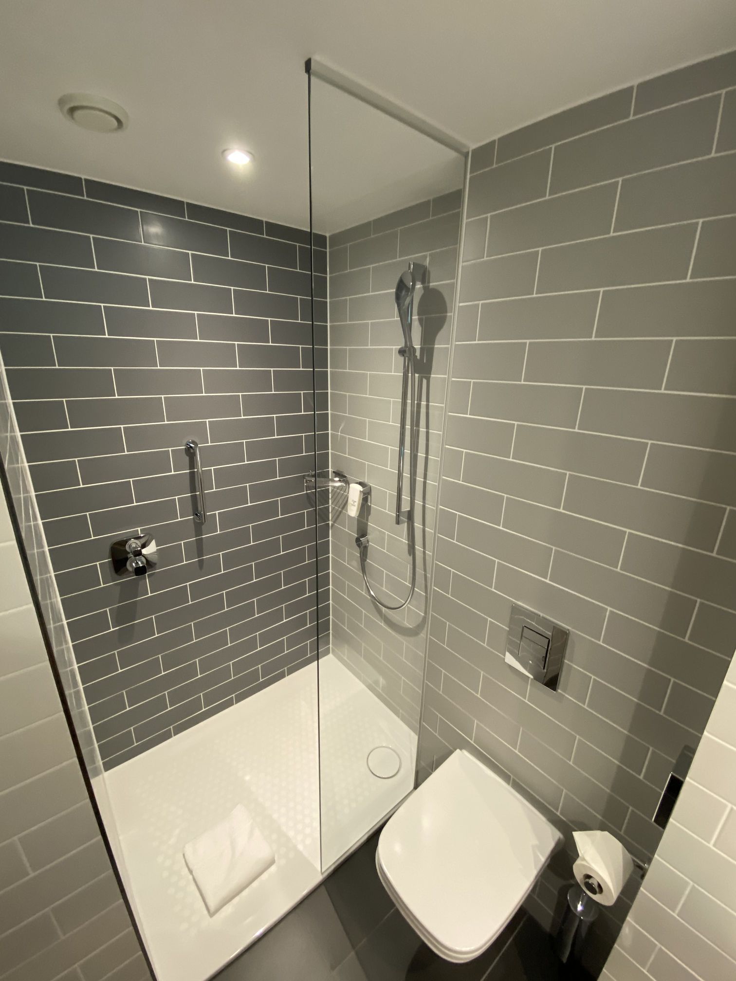 Do dalšího z hotelů Holiday Inn Express v Göppingenu jsme instalovali stylově jednoduchou Walk-in zástěnu, která je ve stropě a ve zdi kotvená v profilu. Zrcadlo s indirektním osvětlením doplňuje skleněný obklad.