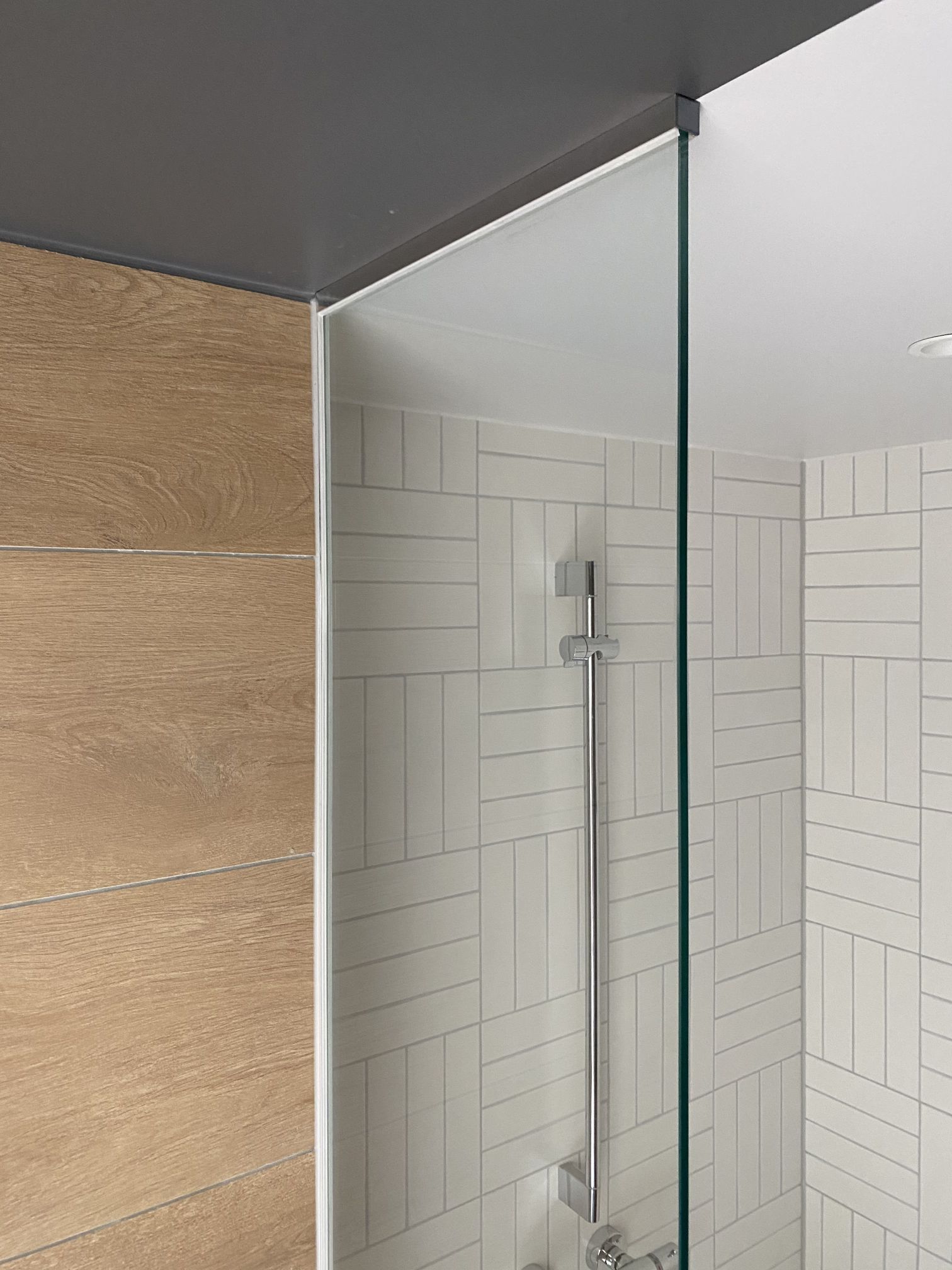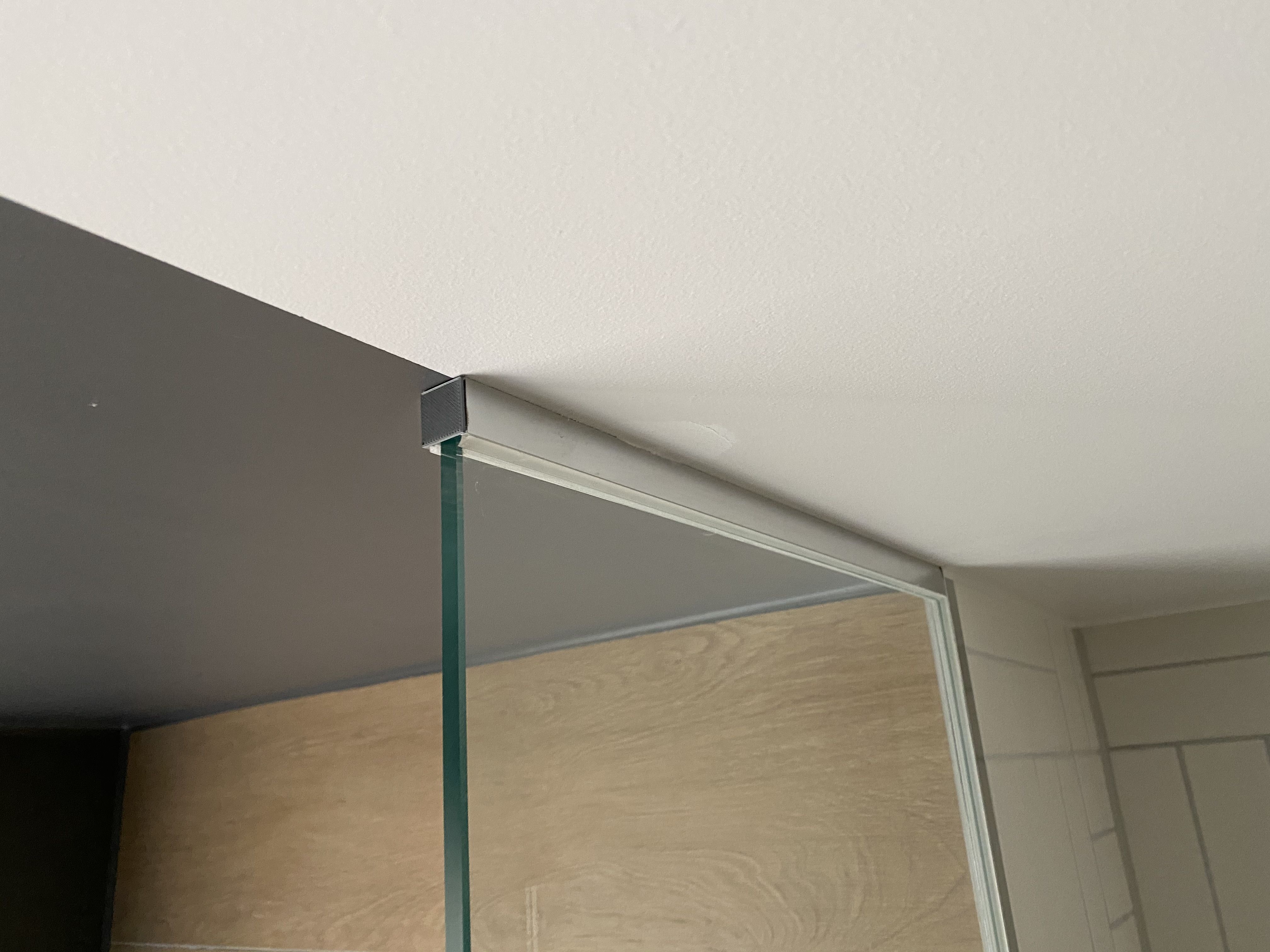 Minimalistická Walk-In zástěna se skládá ze dvou fixních dílů. Čistého vzhledu jsme docílili použitím zapuštěných profilů ve stropě a na nároží. Zajímavostí je výška skel - 2,3m. Jednoduché a trendy.