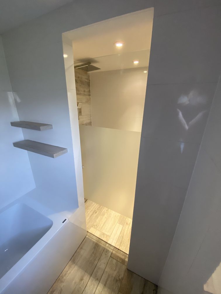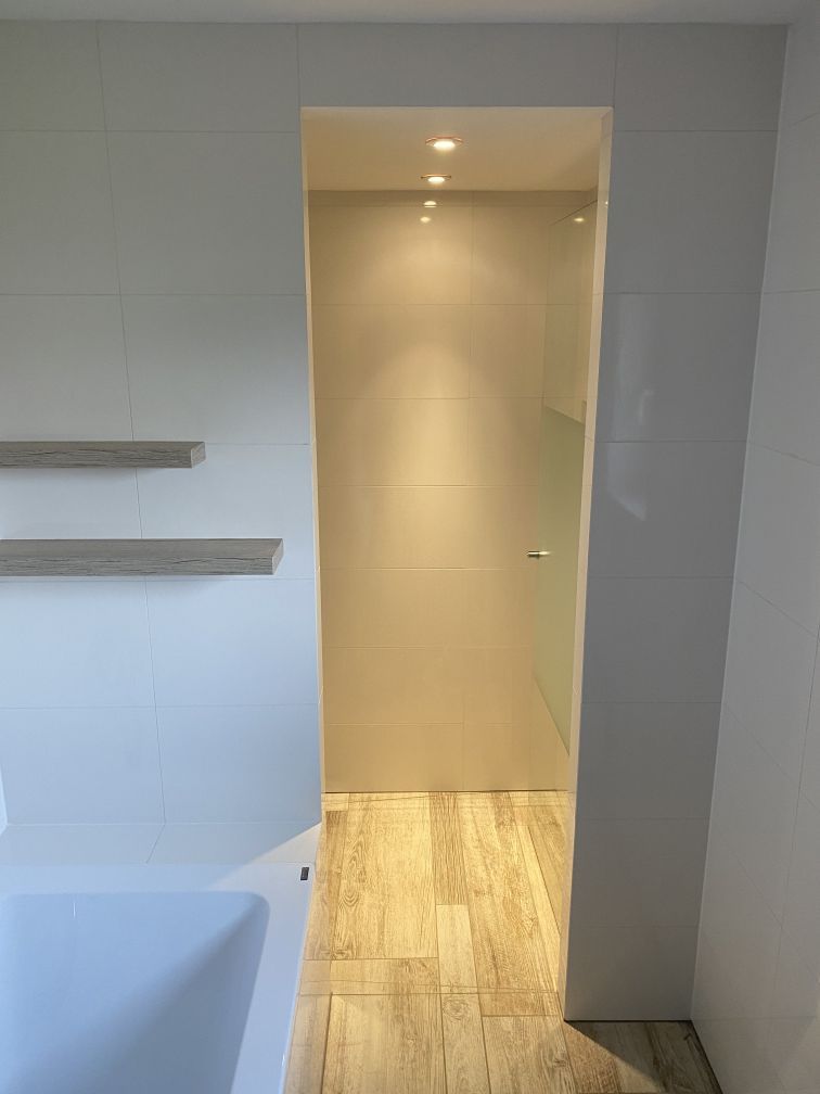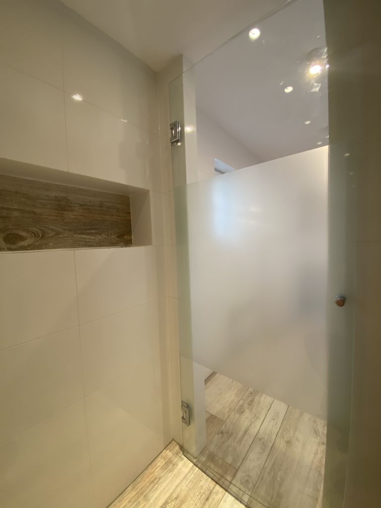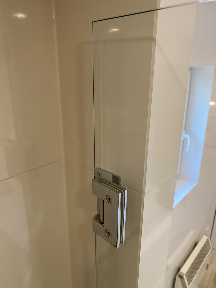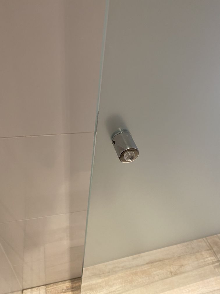 Skleněné dveře oddělují sprchový kout od zbylého prostoru koupelny. Pro zachování soukromí majitelů je plocha skla doplněna sítotiskem, který zároveň působí velice elegantně. K ukotvení skleněných dveří do zdi jsme použili panty MJ. Zajímavým detailem je kulaté madlo s měkkých dorazem.