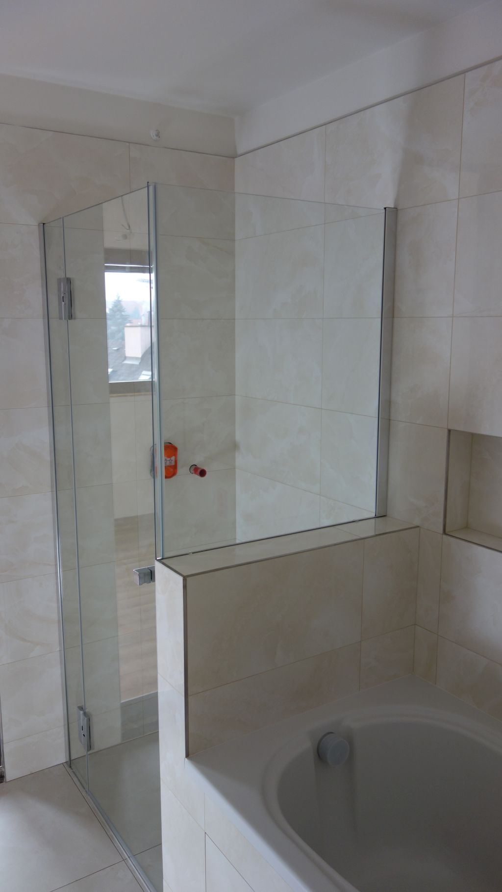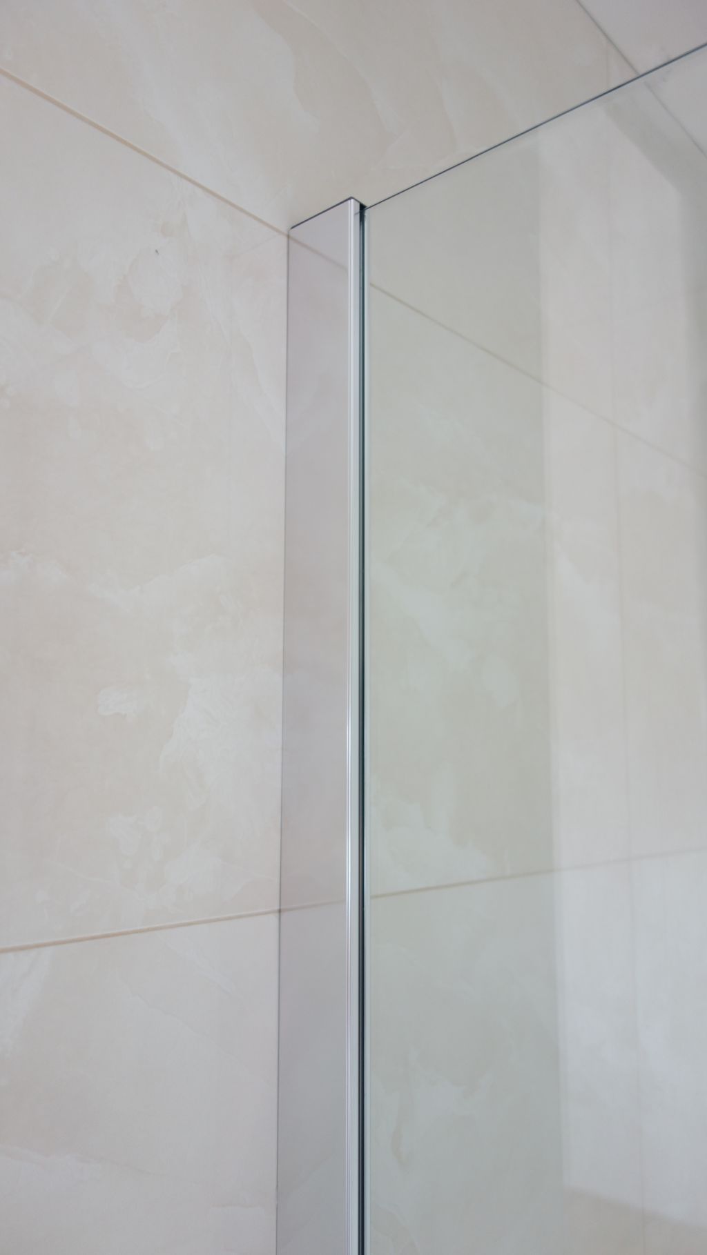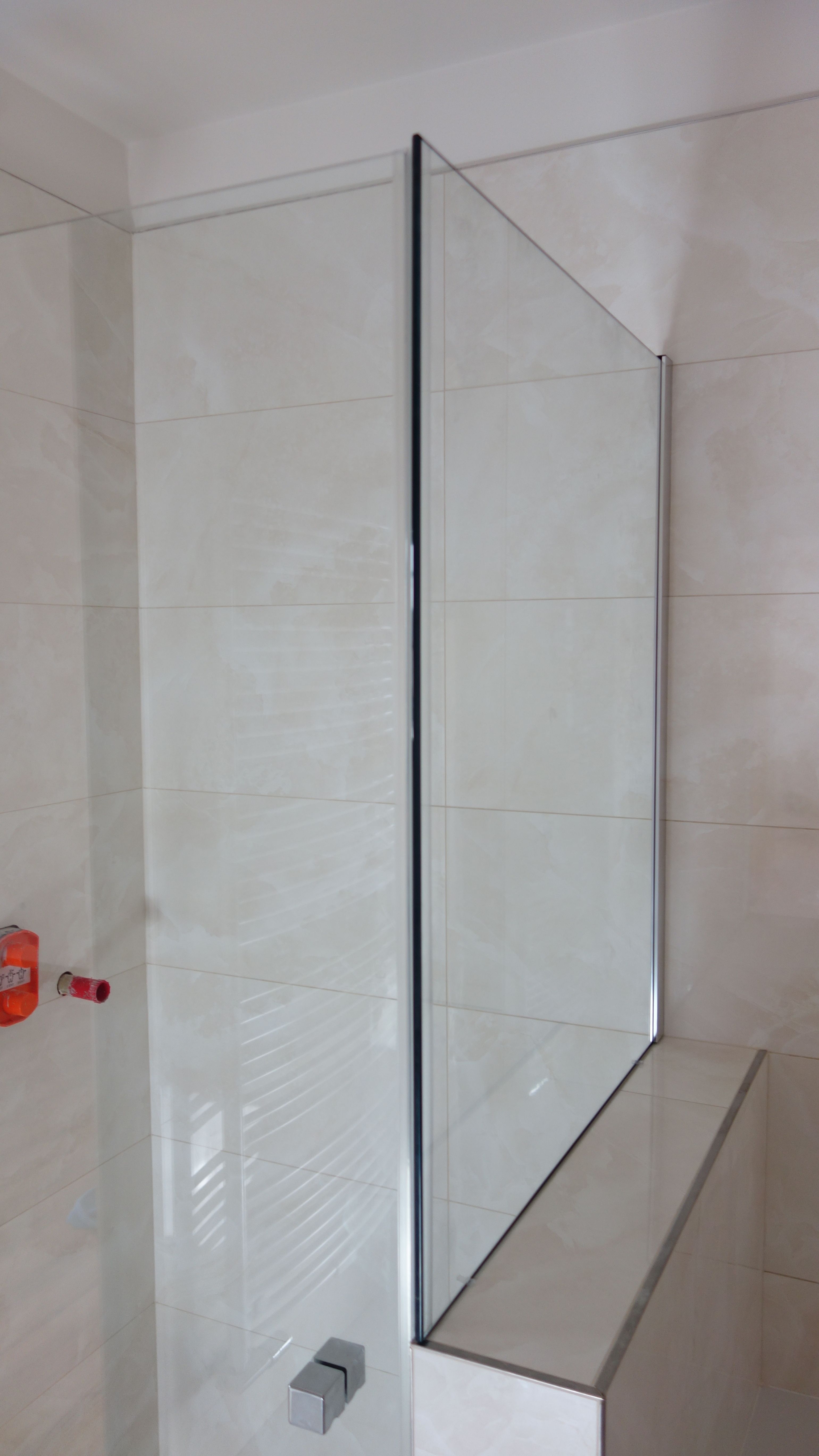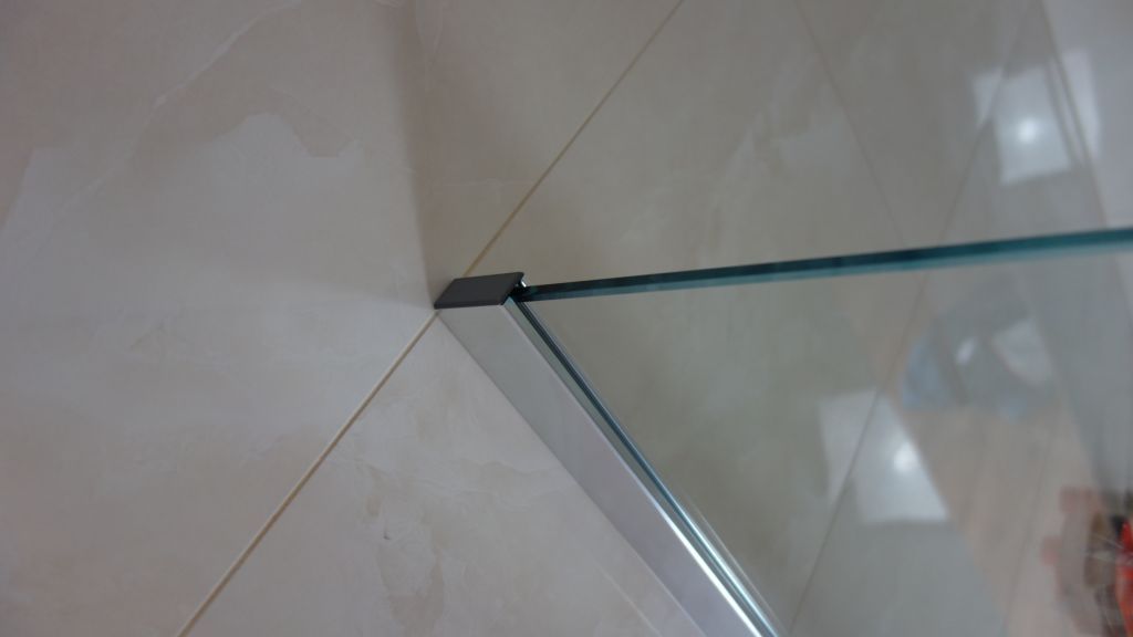 Polorámová sprchová zástěna realizovaná v Dolních Chabrech je příkladem často žádaného napojení sprchové zástěny přímo k vaně. Jeden z bočních dílů zástěny je tak zkrácen. Zajištěno je samozřejmě snadné čištění a údržba napojení k vaně. Použit je nový profil SLIM, který při instalaci zjednodušuje vyrovnání nerovností stěny. I přes štíhlý vzhled je dostatečně tuhý a stabilní. Nemusí tak být použita žádná stropní vzpěra.